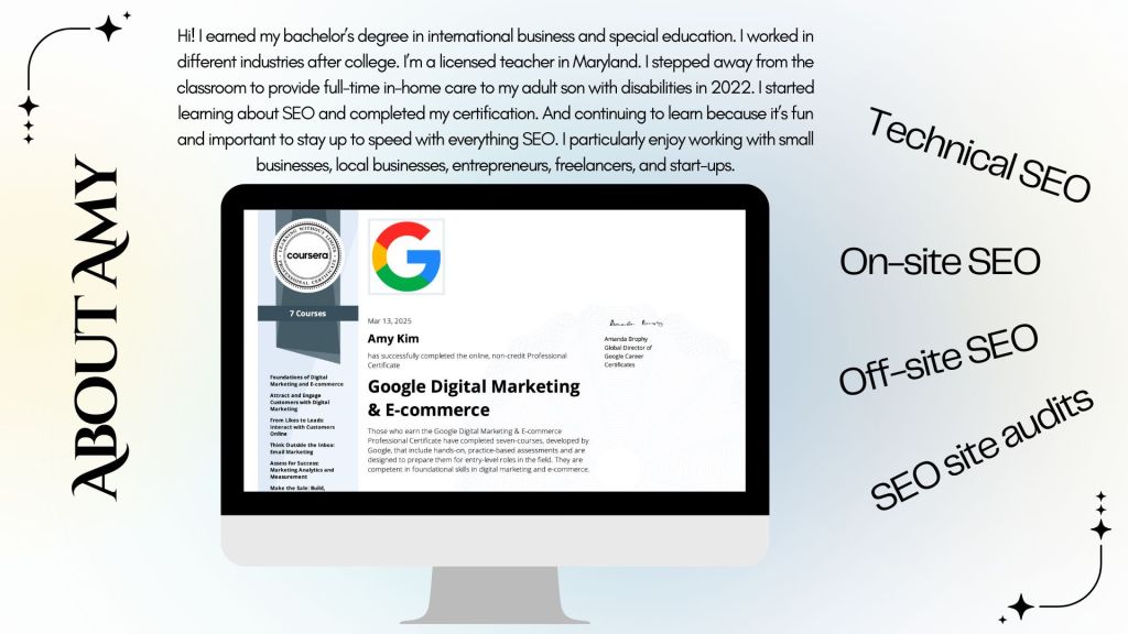 SEO, digital marketing portfolio page with projects and certificates