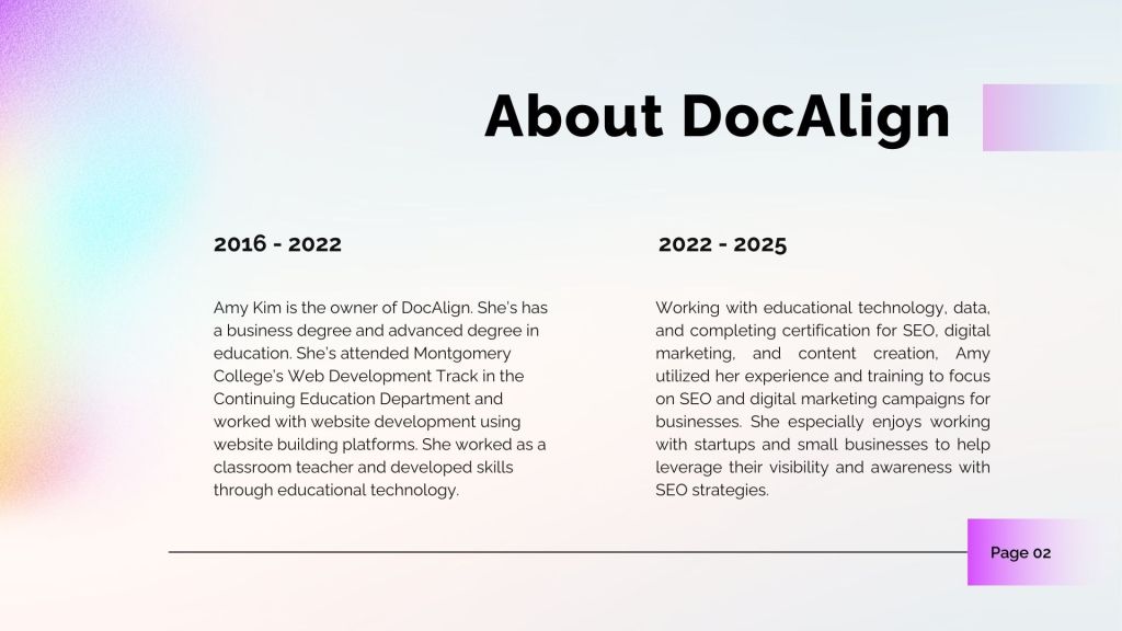 DocAlign is owned by Amy Kim. I provide SEO, digital marketing, and social media marketing services.